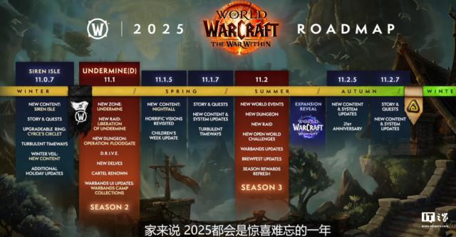 IT 世家 11 月 14 今天,暴雪公布了《魔兽世界》2025 每年更新路线图,将迎来 11.0 多种新的补丁版本,但是没有提到下一个资料片。 12.0 何时推出《魔兽世界:黑暗之夜》版本。