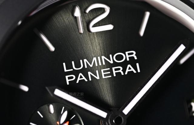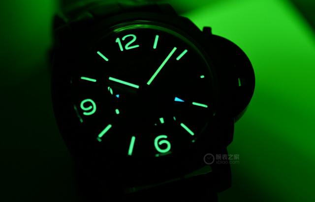 沛纳海代表性的三明治盘面设计,先在上层盘面中空时标刻度,然后在下层盘面和指针中加入 Super-LumiNova ™夜光涂料,让手表在昏暗的光线下呈现出迷人的夜光效果,帮助佩戴者清晰地阅读。