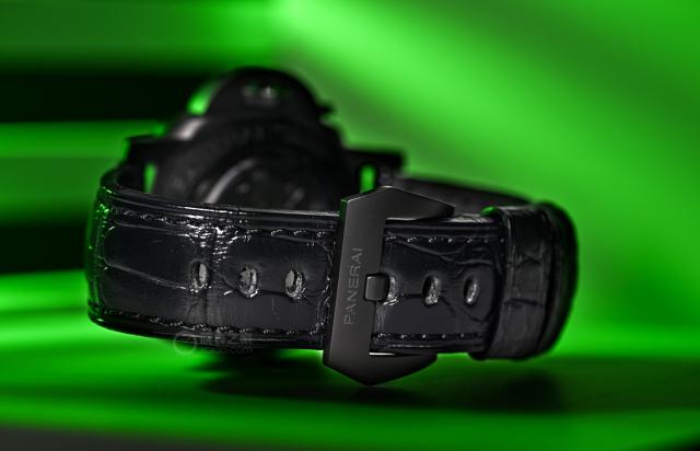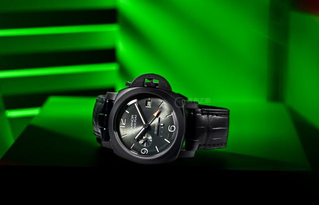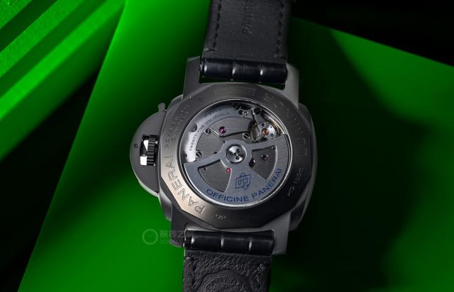 这次新作也选择了市场上最流行的彩色盘面——绿色盘面作为底色。沛纳海擅长玩绿盘,逢绿必火,而对于绿色的使用并非千篇一律,每一款都足够特别,有其独特之处。像 PAM01483 绿色表盘采用太阳辐射图案处理,不仅色调浓厚,而且光影随着光照角度的变化而流动,尤其是以黑色陶瓷表壳为主题,突出了这种绿色,增强了表盘的识别度。