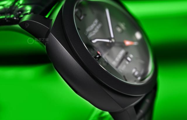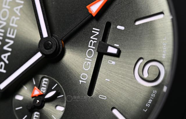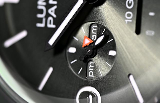 表盘式功能布局设计,也和以前一样, 日期显示窗口设置点钟位置,9 点位为小秒针盘,内置 AM/PM 昼夜指示,6 点位是 10 天线动力显示,指针在两个地方都含有箭头,重要的显示功能沛纳海都有橙色处理,与绿色表盘形成鲜明对比,可读性极佳。
