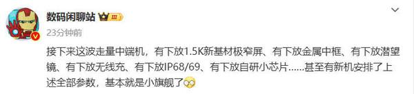 据知名消息人士数码聊天站介绍,各大手机厂商似乎都计划将大量旗舰级配置下放到中端机,包括 1.5K 新型基材极窄屏幕,金属框架,潜望长焦镜头,无线充电,IP68/69 防尘防水、自研芯片等。,从而提高中端产品的竞争力和出货量。甚至上面提到的参数都安排了一些中端机型,基本都是小旗舰。
