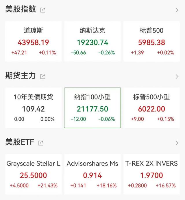 标准普尔 500 指数小幅上涨 0.02%,收在 5,985.38 点;道琼斯指数上涨 47.21 点,收在 43,958.19 点,涨幅 0.11%。纳斯达克综合指数收盘下跌 0.26%,收在 19230.74 点。