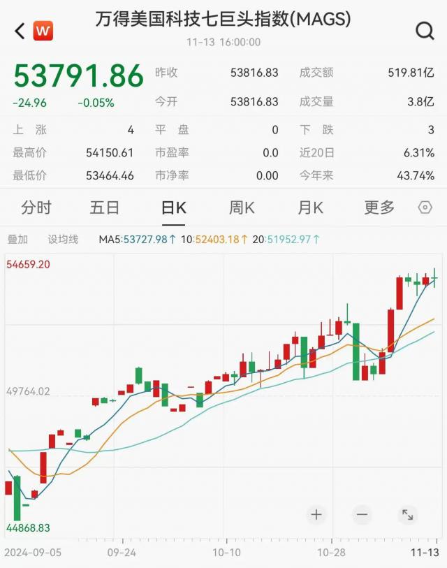大科技股涨跌不一,万得美国科技七巨头指数下跌。 0.05%。就个股而言,亚马逊上涨超过 特斯拉涨了2% 微软上涨0.53% 0.51%,苹果上涨 0.4%,脸书下跌 英伟达跌幅超过0.82% 谷歌跌破1% 1%。