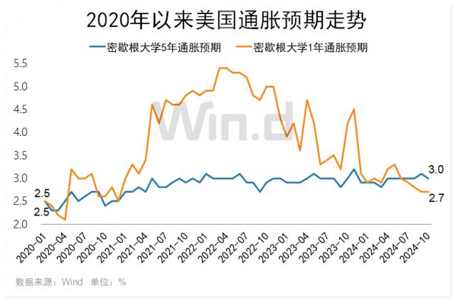 据 Wind 数据显示,美国密歇根大学 1 由于近两年通胀预期持续下降趋势, 2022 年 4 月最高的 5.4% 降到 2024 年 10 月的 2.7%。在此期间,密歇根大学 5 年度通胀预期变化不大,基本维持在 3% 上下。