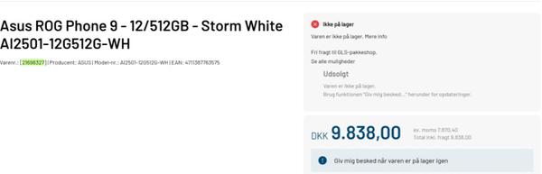 根据该店提前上架的信息,ROG 游戏手机 9 推出一个“飓风白”版本,配置 12GB 内存和 512GB 储存空间,价格为 9838 丹麦克朗(约人民币) 10080 人民币)。当然,这个价格只是欧洲市场的指导价,中国银行版的价格肯定会不一样。这次泄露的信息并没有涉及到手机的其他细节。