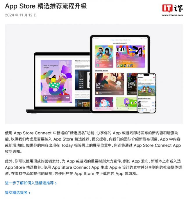 IT 世家 11 月 14 科技媒体日新闻 TechCrunch 昨日(11 月 13 日本)发布博文,报道称苹果公司宣布本周正在宣布。 App Store Connect 中,推出名字“优选提名”(Featuring Nominations)功能。