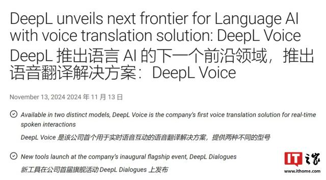 IT 世家 11 月 13 每日新闻,因其同名机器翻译而闻名的人工智能公司 DeepL 今天宣布,推出其首个在线翻译解决方案 DeepL Voice。
