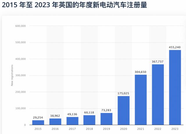 根据 Statista 的数据,2023 2008年,英国注册了合同 455200 一辆新型电动车。和 2022 与年份相比,同比增长 23.8%,是 2020 年度销售额的两倍多。总的来说, 2015 2008年以来,电动汽车销量稳步增长。