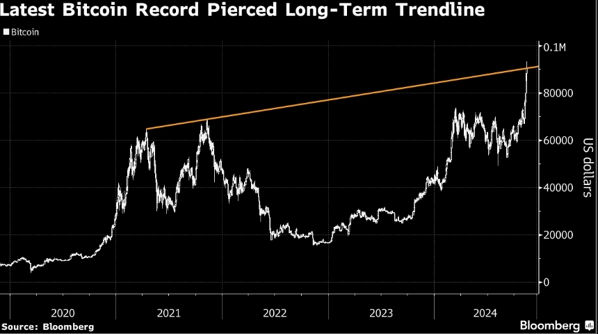 BTC作为世界上最大的数字货币,在这一变化中发挥了核心作用,被称为“特朗普市场”。自选举之日起,其价格上涨了30%以上。今年以来,比特币市场翻了一番。在经历了如此快速的涨幅之后,市场普遍担心会出现一轮盈利回吐。