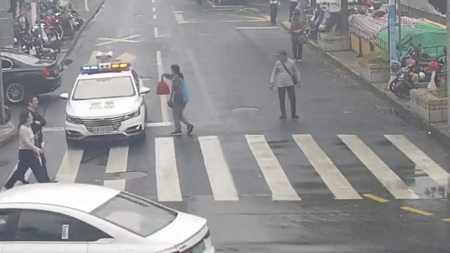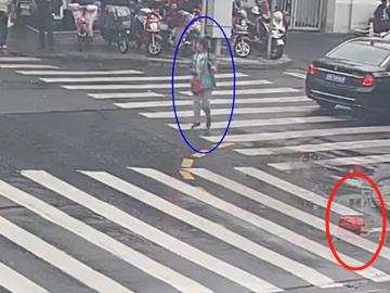 公众视频画面显示,当天早晨 8 点多,当一个穿着蓝色斑点夹克的市民骑着电动自行车经过这里时,一个红色的袋子掉在路中间,车主没有注意到,继续沿着博乐路向北骑行。