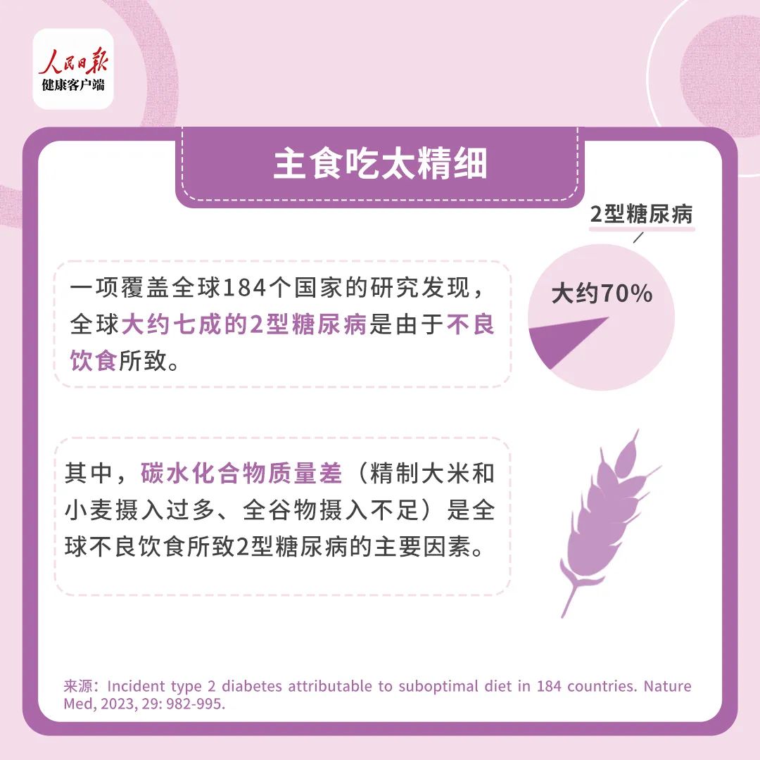 一项覆盖全球184个国家的研究发现,全球约70%的2型糖尿病是由不良饮食引起的。其中,全球不良饮食引起的2型糖尿病的主要因素是碳水化合物质量差(精米和小麦吃得太多,全谷物摄入不足)。
