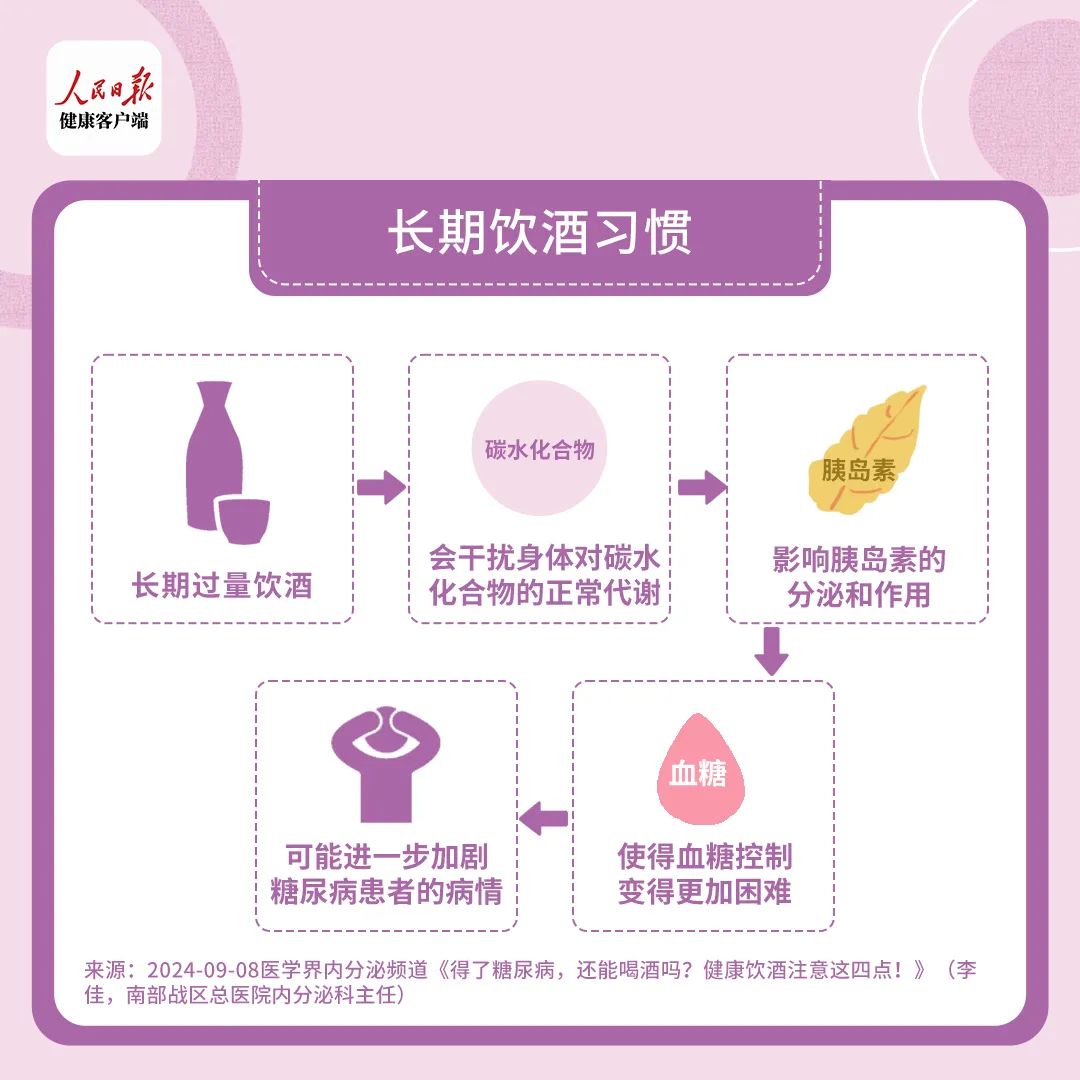 长期过量饮酒会干扰碳水化合物的正常代谢,影响胰岛素的分泌和作用。胰岛素分泌可能异常,降低血糖的作用会大大降低。它不仅使血糖控制更加困难,而且可能进一步加重糖尿病患者的病情。