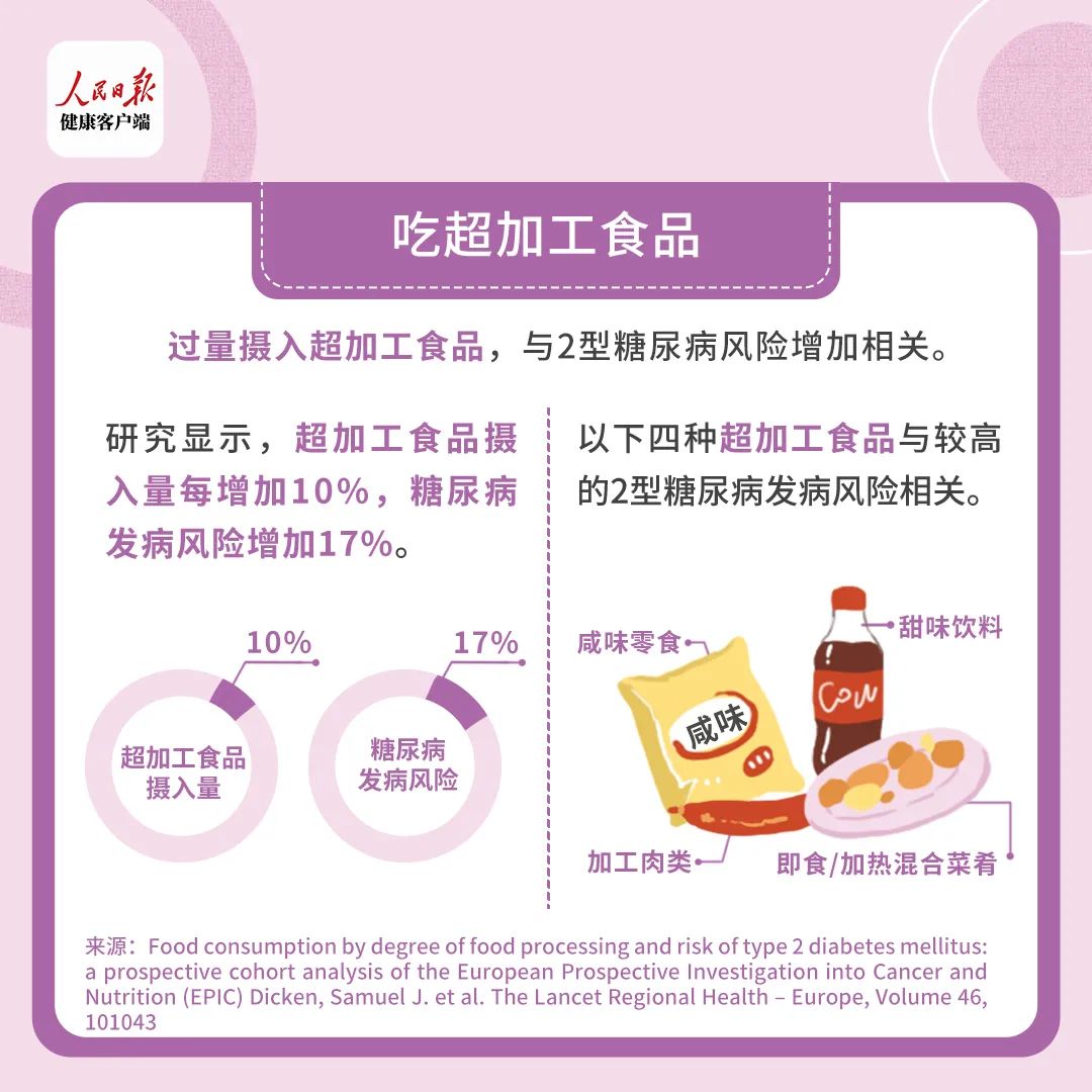 过量摄入超加工食品与2型糖尿病风险的增加有关。研究表明,超加工食品的摄入量每增加10%,糖尿病风险增加17%。此外,根据对不同类型超加工食品的分析,盐零食、加工肉类、即食/加热混合菜肴和甜饮料与2型糖尿病的高风险有关。