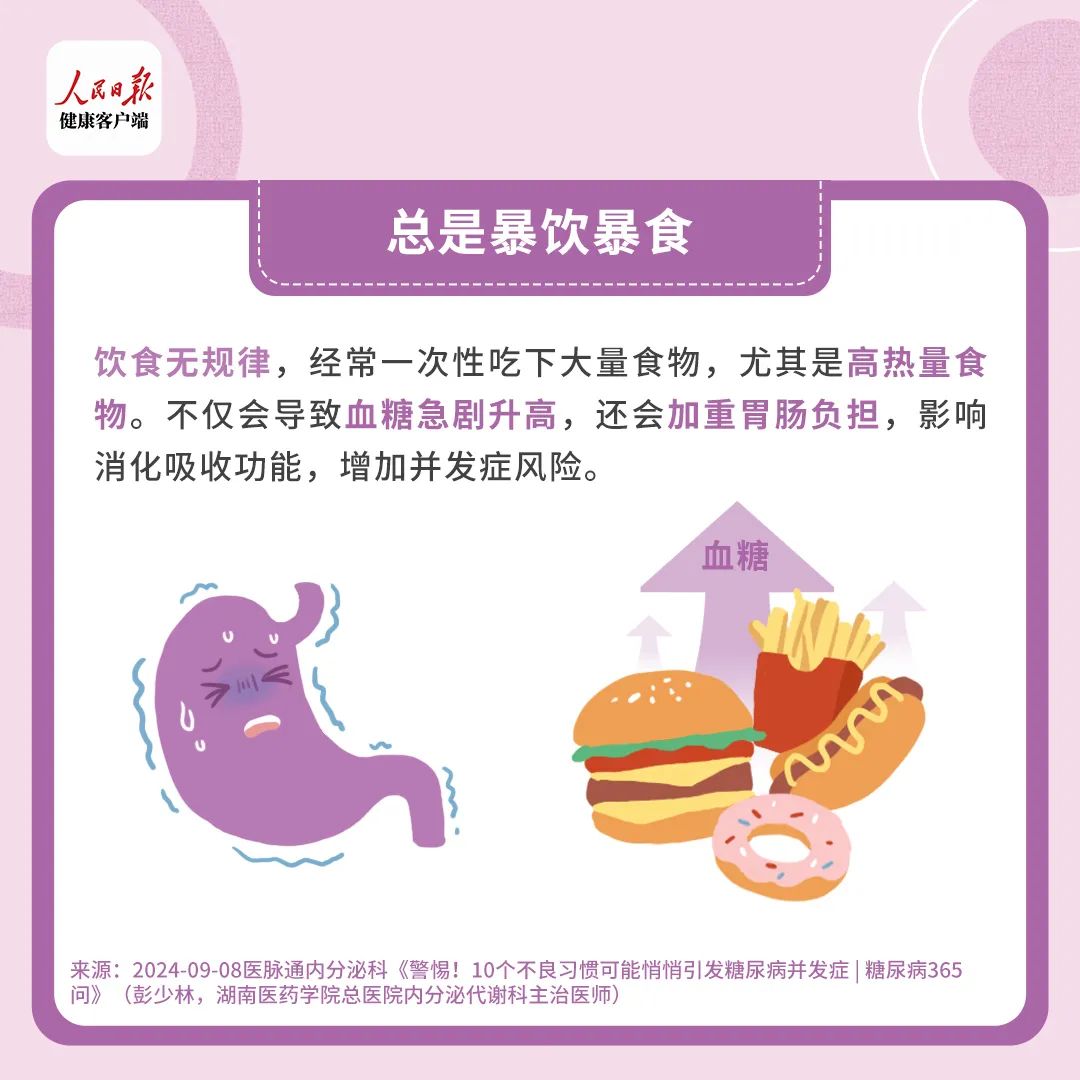 饮食不规律,经常一次吃很多食物,尤其是高热量的食物。不仅会导致血糖急剧升高,还会增加肠胃负担,影响消化吸收功能,增加并发症风险。