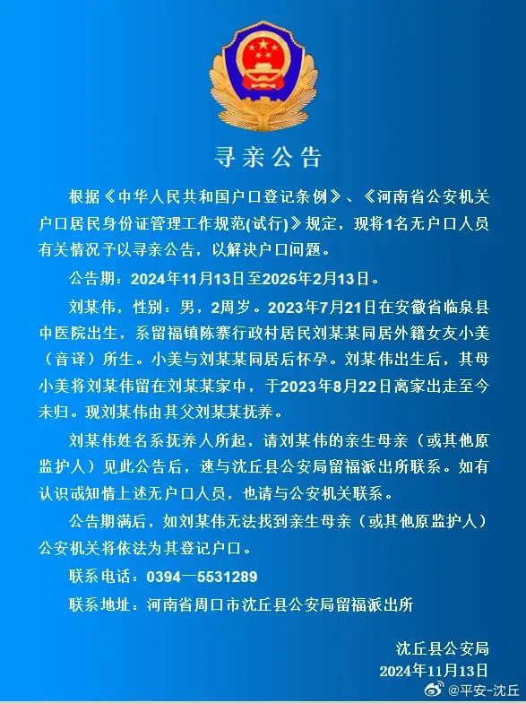 公告显示:刘某伟,性别男,2岁。2023年7月21日出生于安徽省临泉县中医院,是留福镇陈寨行政村居民刘某某同居外国女友小美(音译)生。小美与刘某某同居后怀孕。刘某伟出生后,母小美将刘某伟留在刘某某家中,自2023年8月22日出走至今未归。现在刘某伟由父亲刘某某抚养。