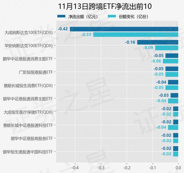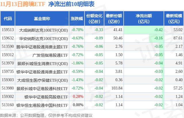 当天有 16 只跨境 ETF 资金净流出出现在基金中,其中大成纳斯达克排名第一。 100ETF ( QDII ) (159513),份额下降 3300.0 万份,净流出额为 4220.46 万元。