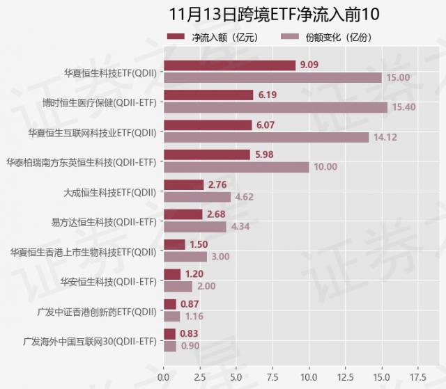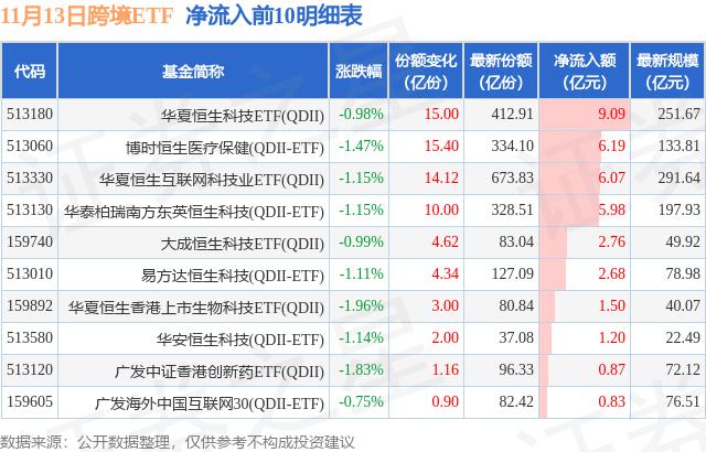当天有 50 只跨境 ETF 资金净流入出现在基金中,其中华夏恒生科技净流入排名第一。 ETF ( QDII ) (513180),份额增加 15.0 十亿份,净流入额为 9.09 亿元。