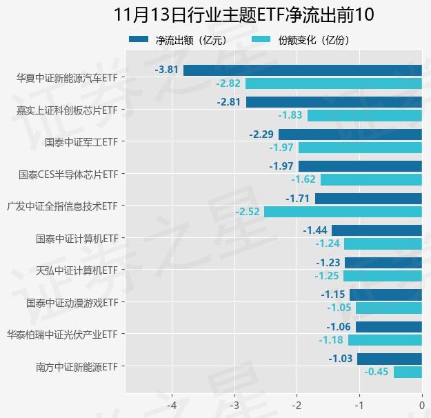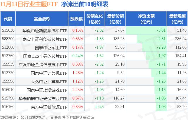 当天有 166 只行业主题 ETF 资金净流出,其中华夏中证新能源汽车净流出排名第一。 ETF(515030),份额下降 2.82 一亿份,净流出额为 3.81 亿元。