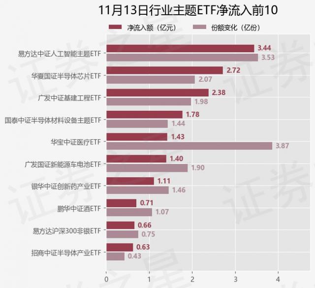 当天有 153 只行业主题 ETF 资金净流入,其中E基金净流入排名第一的是E基金CSI人工智能主题。 ETF(159819),份额增加 3.53 十亿份,净流入额为 3.44 亿元。