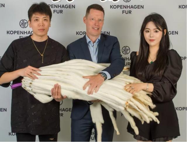 强哥(左)和小茹(右)在国外参加貂皮拍卖会。