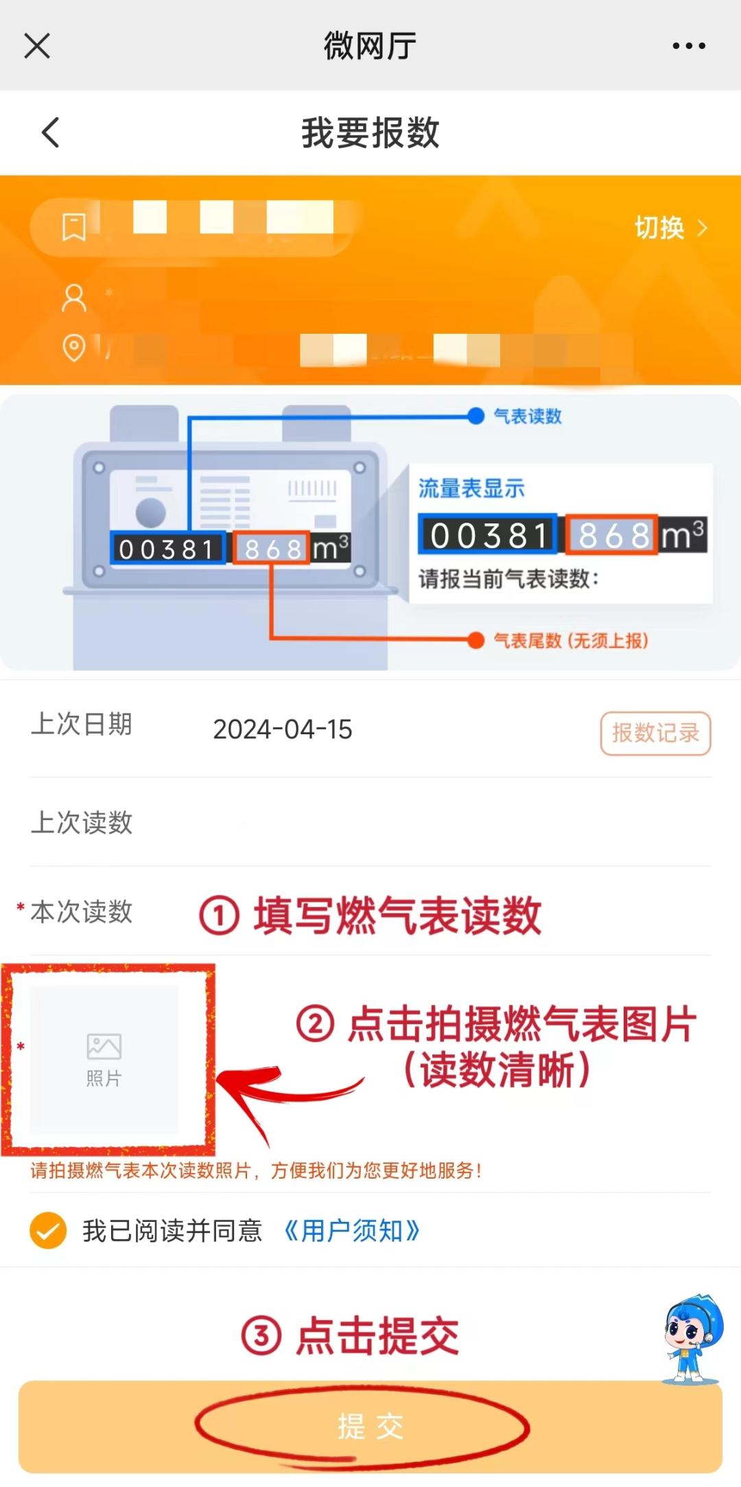 步骤二:点击“我要报数”,填写燃气表盘读数。上传相关照片,点击提交。