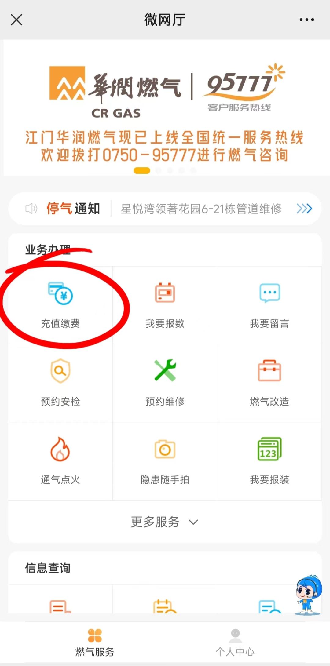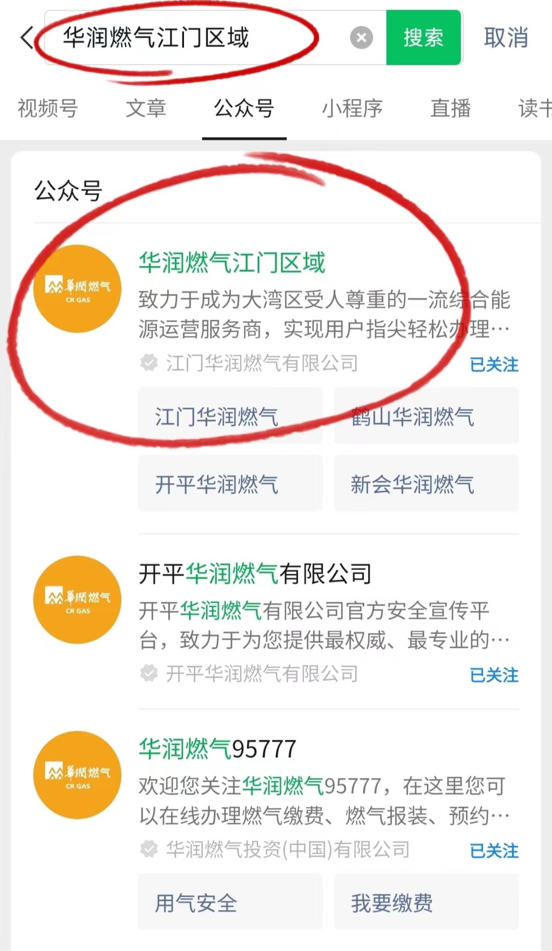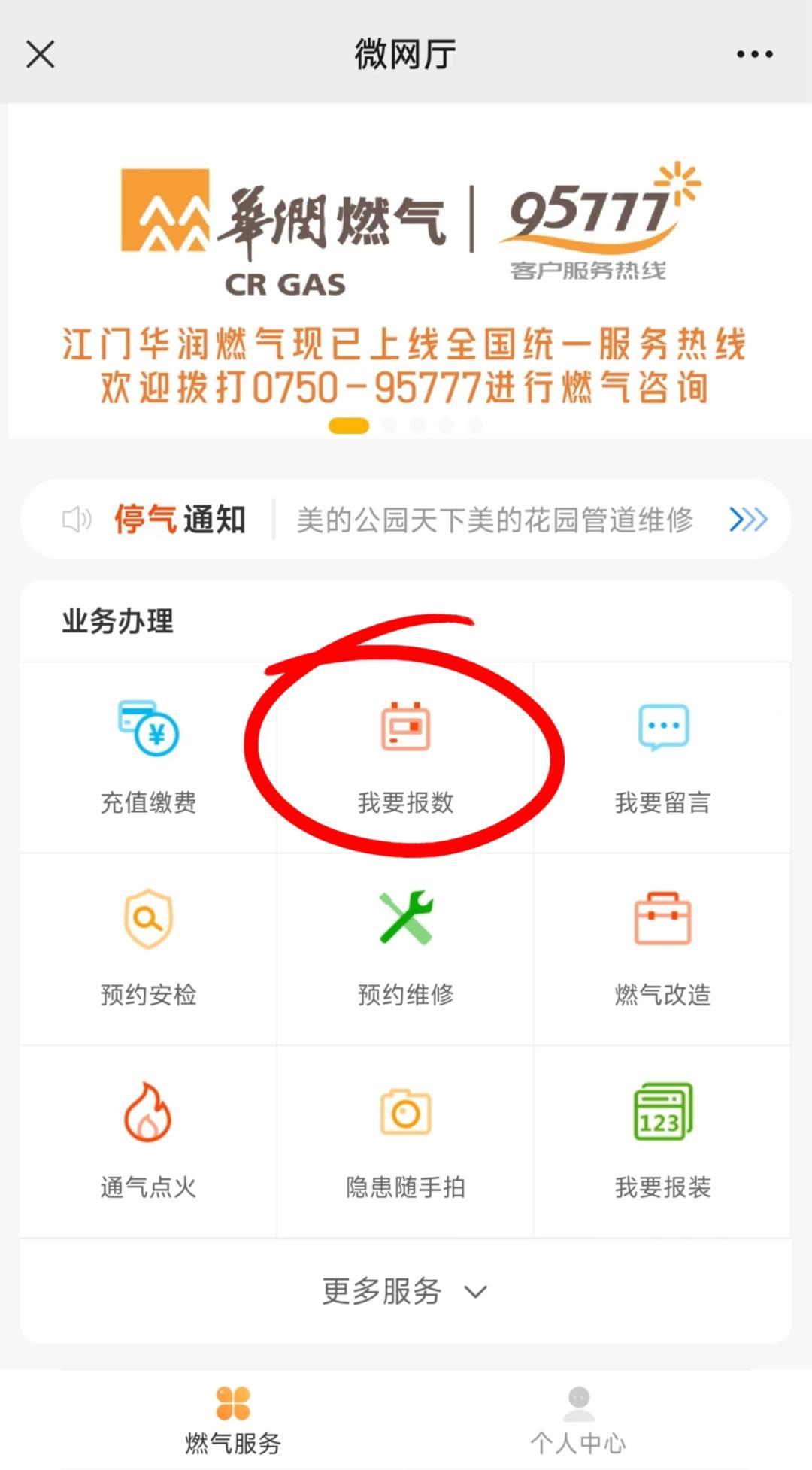 步骤一:微信搜索【华润燃气江门区】,点击进入公众号,进入【微网厅】;