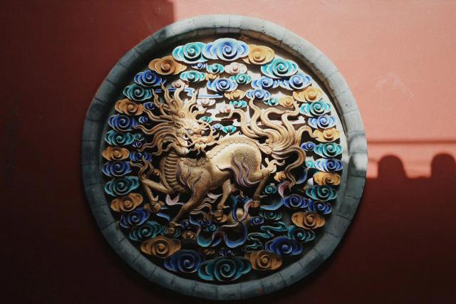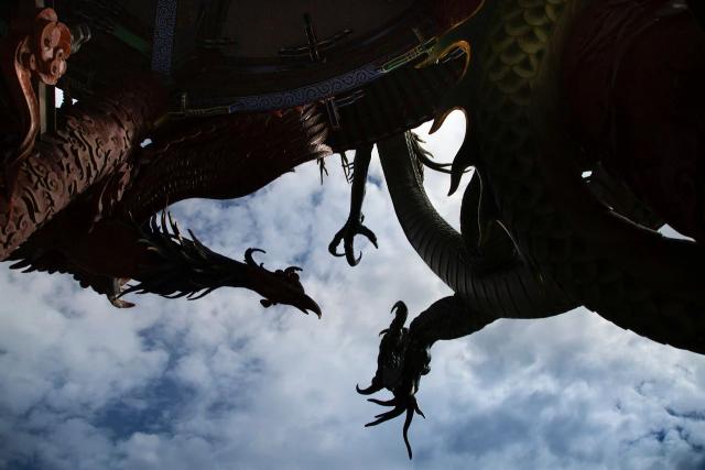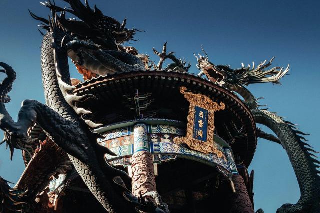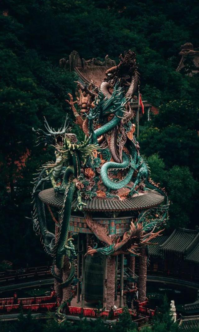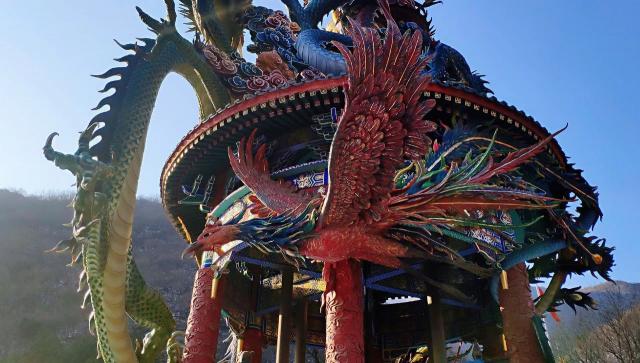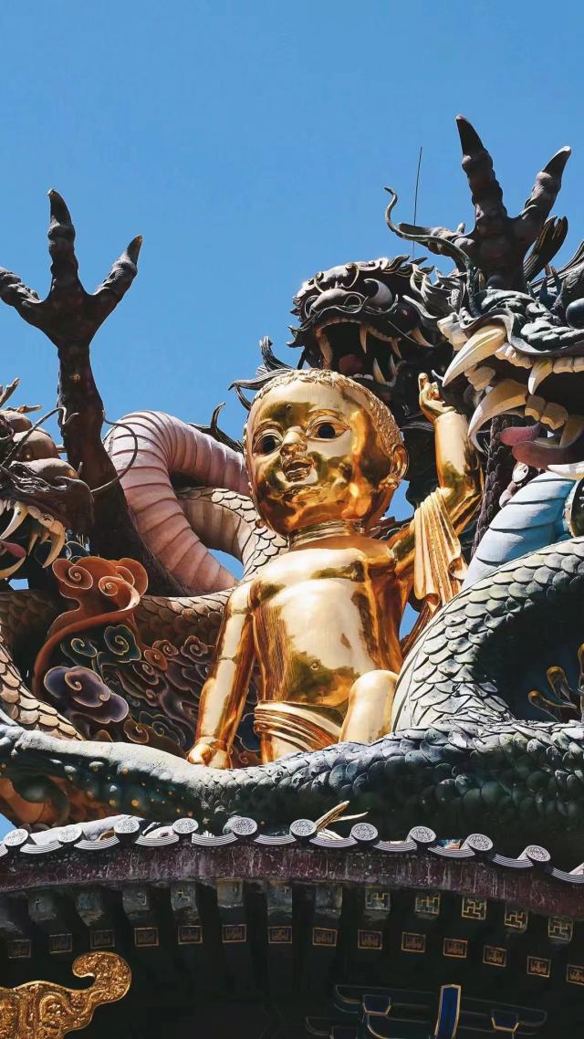 不管是屋顶上的菩萨佛像,还是两边的龙凤巨鸟,