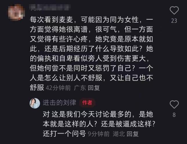 也有网友表示,每次看到麦琳,都是又气又心疼。我很好奇她是这样还是因为一些经历。刘律师在评论区表示,这一点也是大家讨论最多的问题之一。