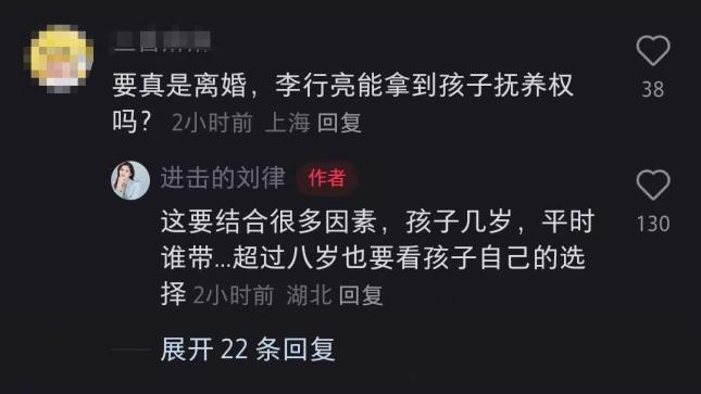 还有人问,如果麦琳和李行亮离婚,谁能得到孩子的抚养权?刘律师回应说,结合很多因素,超过八岁就看孩子的选择了。