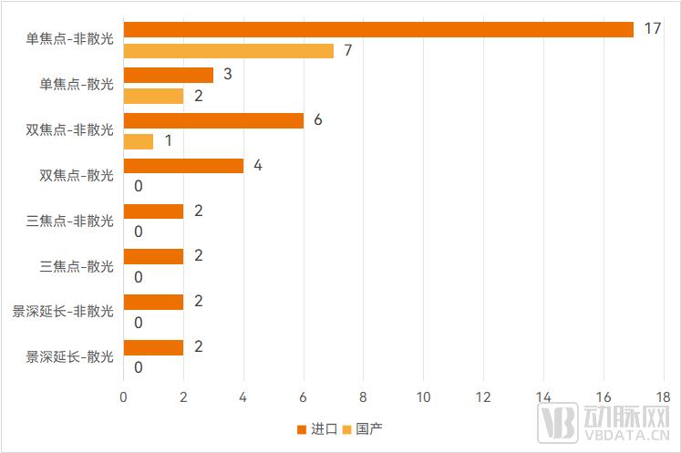 本轮采集的人工晶体包括八种类型,涵盖不同层次的低、中、高商品。其中,低端代表产品单焦点——非散光人工晶状体,分别中标17款进口产品和7款国产产品;在中端产品方面,只有爱博诺德和蕾明视康的产品可供选择;在高端品牌中,三焦点人工晶体和景深的增加(Extended Depth of Focus,下面简称EDOF)从人工晶体中选择的产品都是进口的。