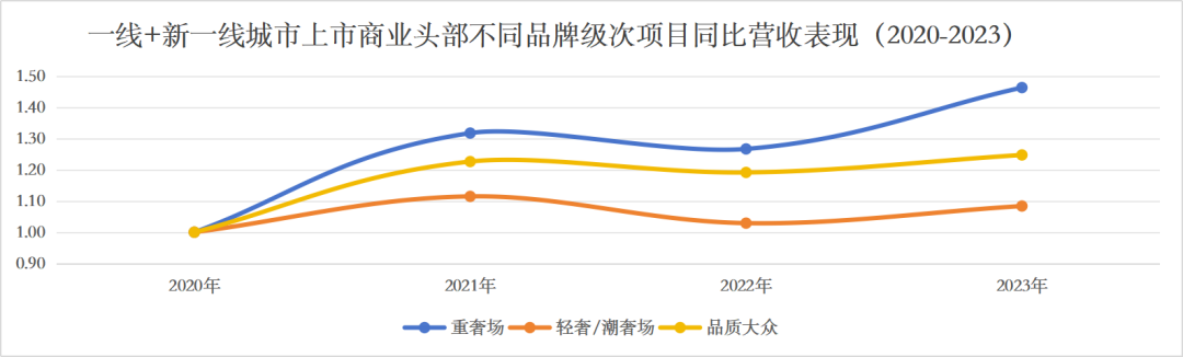 纵观2020年至2023年各项目利润的变化,可以看出购物中心的马太效应越来越明显。虽然外部市场持续低迷,但头部项目仍呈上升趋势,头部项目与非头部项目的业绩差距不断扩大。与此同时,我们发现头部项目内部也有明显的分化,从覆盖范围来看,出现了城市级别。>区域级>从品牌层面来看,副城级现象出现了重奢现象。>品质大众>轻盈奢华的情况下,线下商业消费不断向全城、高档、在地、亲民这两大端头集中,同时消费习惯下沉,而且进一步综合城市能级、覆盖范围、品牌级等多个维度考虑项目分化的情况所得到的结果更加复杂多样。