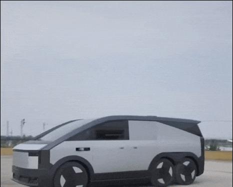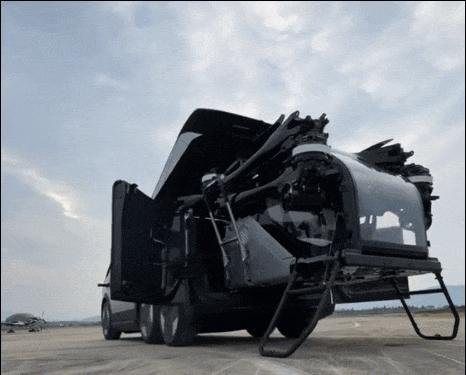 首先,我们来看看期待已久的“陆地航空母舰”。不得不说这个名字也挺霸气的。它看起来有点像Cybertruck的六轮车。后备箱配有一个单杆操作飞机,可供两个人乘坐。它们结合在一起,被称为“陆地航空母舰”。