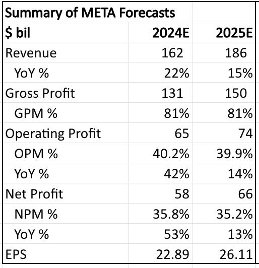 预计到2024年Meta的收入将增长224年。 Meta的收入在24年前三个季度增长了22%,而在2024年第四季度,我预测收入将与前三个季度同步增长。由于业务趋势持续相似,其应用程序系列参与度较高。预计到2025年收入增长将下降到15%。Meta的投资应该会继续提高其商业化水平,因此收入增长应该继续以提高Reels货币化水平和提高其应用系列参与度的形式出现,因为它将继续投资其AI推荐引擎。随着应用系列参与度的提高,Meta的广告收入也越来越高。