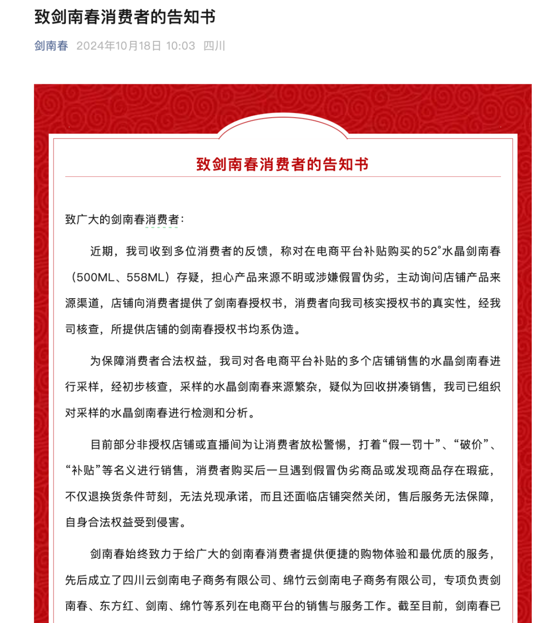 十月十八日,剑南春发文称,近日,公司收到多位客户的反馈,称52位客户在电商平台补贴购买。°剑南春(500ML)、558ML)存疑,担心产品来源不明或涉嫌假冒伪劣,主动询问店铺产品来源渠道。店铺为消费者提供剑南春授权书,客户向公司核实授权书的真实性。经公司审查,提供店铺的剑南春授权书全部伪造。
