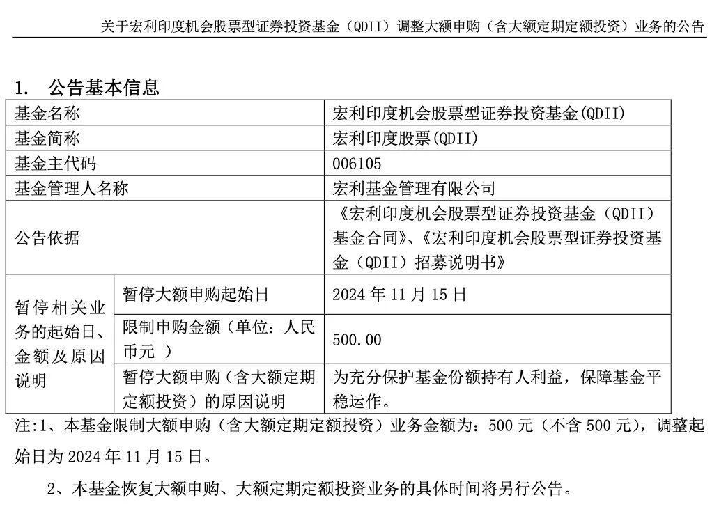 同日,宏利基金也发布公告称,为充分保护基金份额持有人利益,保障基金稳定运行,宏利印度旗下有机会(QDII)大额认购(含大额定期定额投资)的业务金额自11月15日起为500元(不含500元)。