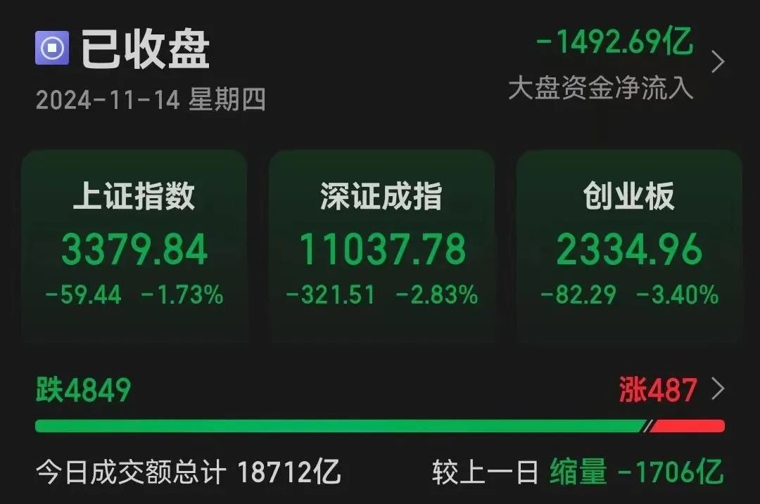十一月十四日,三大a股指数集体下跌。截至收盘,上证综指下跌1.73%,深成指下跌2.83%,创业板指数下跌3.40%。全天市场成交额为18712亿元,比昨天缩水1706亿元。超过4800只股票在整个市场上都是绿色的。今日a股走势备受关注,下午,“a股”话题冲上热搜榜前列。