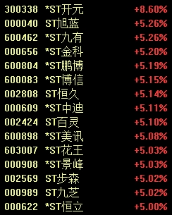 ST板块今日表现异常活跃,逆势上涨。在这些股票中,*ST开元涨幅超过8%,ST旭蓝、*ST九有等20多只股票涨停。