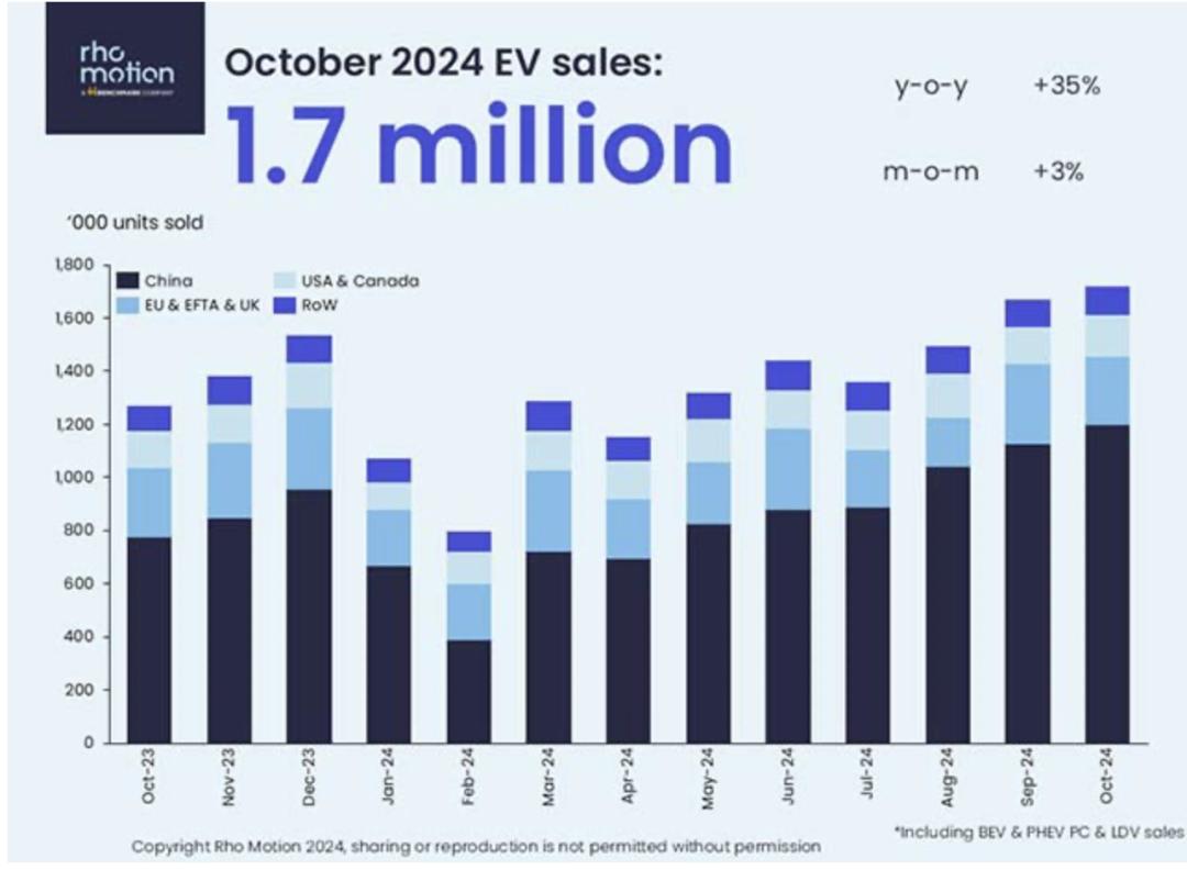 Rho是一家电动汽车研究公司 根据Motion的最新数据,2024年10月,全球电动汽车销量达到170万辆,比2023年9月创下的前一个记录高出5万辆。其中,中国市场再次创下月度销售新纪录,共销售120万台,环比增长6%,同比增长50%以上。截至2024年10月,中国电动汽车市场同比增长38%,全球市场增长24%。具体而言,全球电动汽车销量达1330万辆,同比增长24%;在中国,市场销售额达840万台,同比增长38%;欧盟、欧洲自由贸易联盟和英国的销售额为250万台,比去年同期下降3%;美国和加拿大的市场销售额为140万台,比去年同期增长9%;全球其它地区销售额达100万台,同比增长27%。
