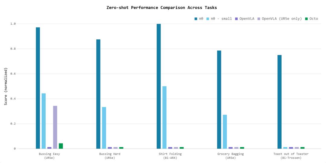 当然,π0并非唯一的通用机器人基本模型,Physical 在Zero-shot的条件下,Intelligence使用了一些实际的任务,如折叠衣服、从面包机中取出吐司面包、包装杂物等。,以测试模型解决实际问题的能力。不管是什么,数据显示π0还是较小的π0-small,就解决问题的能力而言,它们都比现有的OpenVLA模型要好得多。