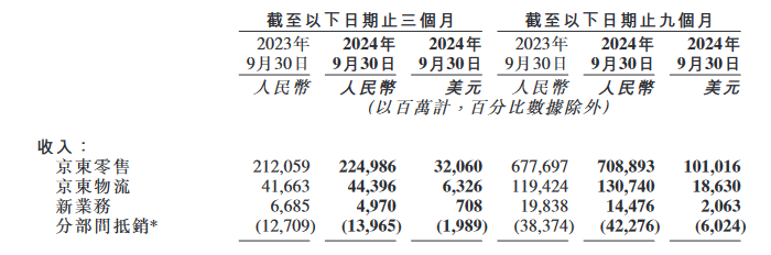 具体而言,第三季度,京东零售业实现营收2249.86亿元,同比增长6.1%。;京东物流实现营收443.96亿元,同比增长6.6%;实现新业务收入49.7亿元,同比下降25.7%。