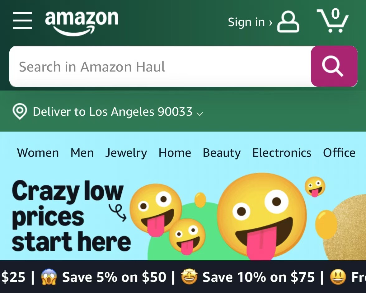 低价格商城页面强调“Crazy low prices Start here”,为消费者提供多种优惠方案,包括25美元内免费运费,50美元节省5%、75美元节省10%等等。如果与他人共享商城链接,也会显示“Find new faves for way less”。