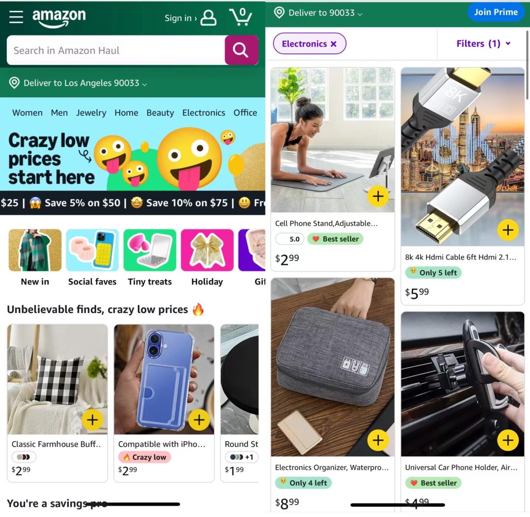 亚马逊低价商城Amazon11月12日 Haul已经在移动终端正式上线,目前网爆消息是首批商家内测阶段,明年将大规模招商。
