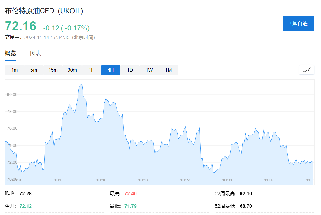 自10月初以来,原油价格已经下跌了11%,因为交易者专注于美洲日益增长的产量。目前,布伦特原油期货的交易价格接近一桶72美元。
