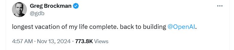 公司总裁格雷格·布罗克曼·布罗克曼,OpenAI创始人之一(Greg Brockman)星期二(十一月十二日)宣布提前结束假期,回到公司担任总裁。三个月前,他宣布要休假到年底。