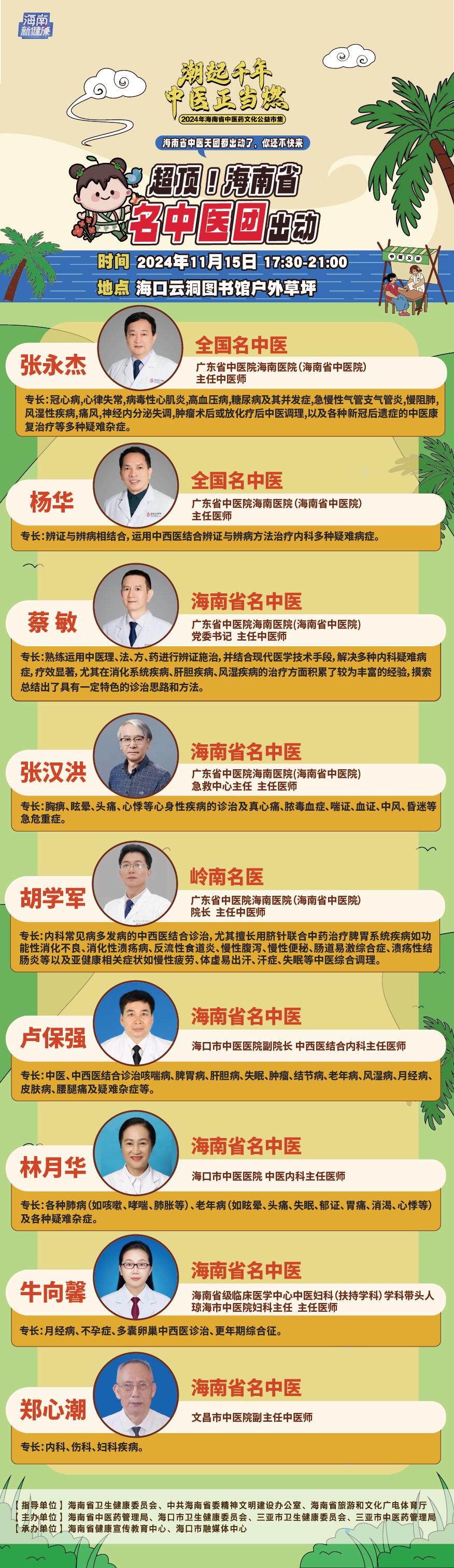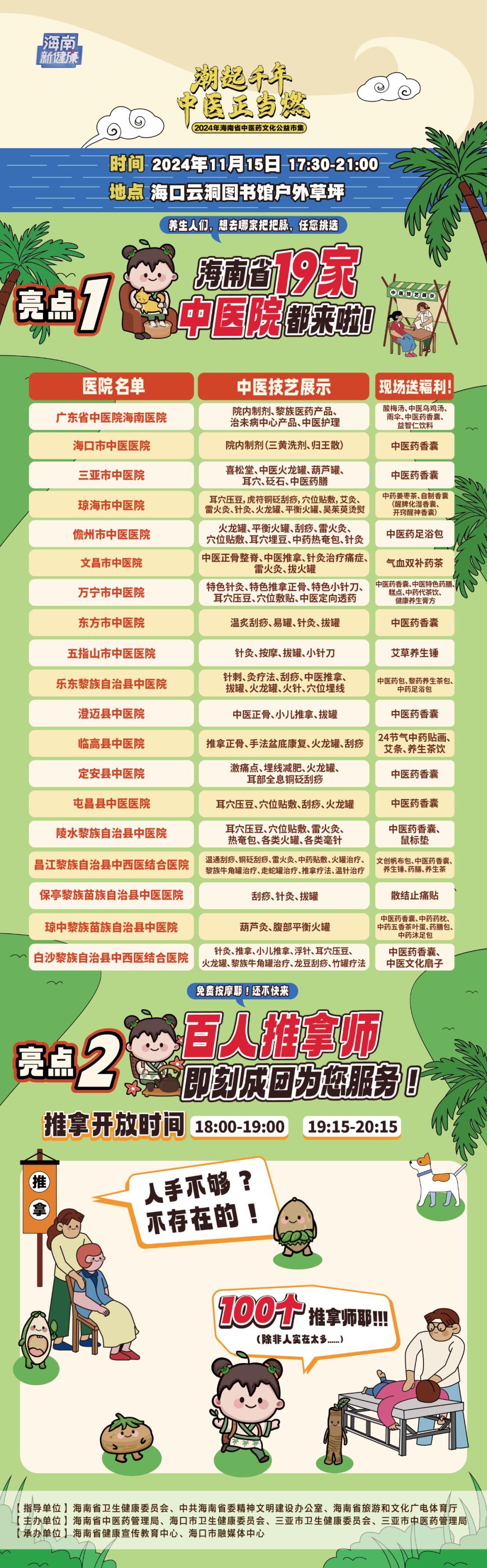 “潮起千年 2024年海南省中医药文化公益市场活动将于11月15日(本周五)17日举行。:30-21:00在海口云洞图书馆户外草坪广场盛大开放!作为中国第一个集中在全省中医院联合举办的中医文化公益市场,今年市场规模全新升级,汇集全省19家里医院免费推荐免费门诊,邀请全国著名中医和省级著名中医在镇上就诊,展示黎族药业技能。另外,海南省中医院还将邀请100名按摩师,为现场市民提供免费按摩服务!还有各种各样的活动,如朱砂、中药茶、保健操、特色手工艺、国风现场音乐会、中西乐合奏团等。,等待市民和游客来打卡,一起感受中医文化带来的独特魅力!