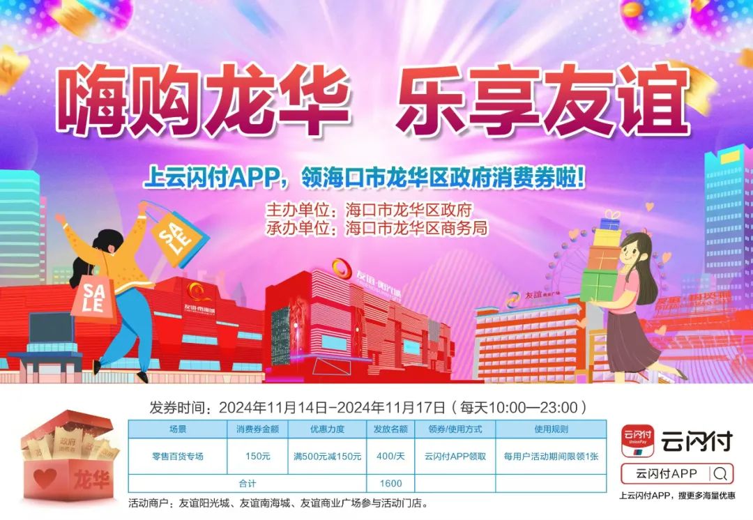十一月十四日至十七日每天十点,龙华区发布新一轮“嗨购龙华”,降低500元150元。 享受友谊”政府优惠券。该优惠券活动的商家参与了友谊阳光城市、友谊南海城市和友谊商业广场的活动商店。活动期间,每位客户将获得一张优惠券。用户可以从中国银联快通App“政府优惠券”标识进入“海口市龙华区政府优惠券”区领取优惠券。