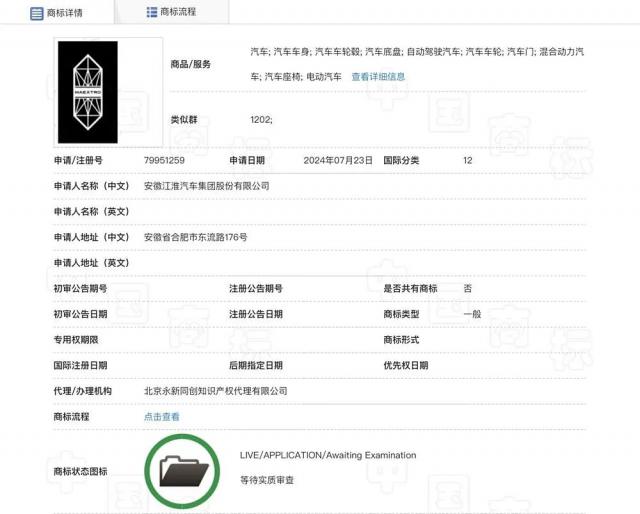 与此同时,这次我们还增加了一个有趣的设计。我们在汽车前部和上部使用了立标。 Logo,整体造型有点像一个小大盾,但内部做了立体的钻石切割造型,提高了整体的精致程度。这个立标当然是立标 Logo 我们并没有凭空想象,而是在国家知识产权局商标局找到的。我们可以看到申请人的名字是安徽江淮汽车,申请日期是在。 2024 年 3 月份。所以我个人认为,作为一款百万级的豪华车型,无论是品牌认可度还是汽车定位,放一个立标都没有错。这样的例子在豪华车型中可能有很多,甚至成为品牌的象征性元素,可以尝试一下。