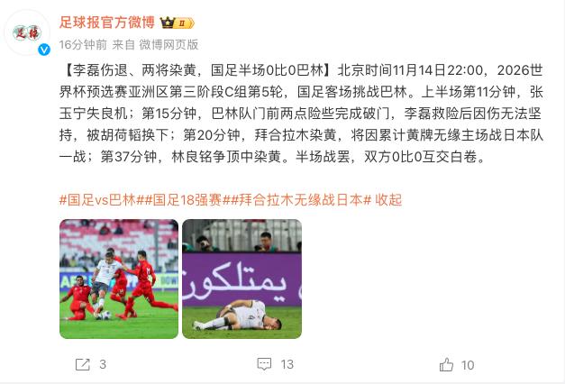 22222北京时间11月14日:亚洲区第三阶段C组第五轮,00,2026年世界杯预选赛,国足客场挑战巴林。上半场第11分钟,张玉宁失去了机会;第15分钟,巴林队门口2点差点破门,李磊救险后因伤无法坚持,被胡荷韬换下;第20分钟,拜合拉木染黄,将因累积黄牌而无缘日本队主场一战;第37分钟,林良铭在顶上染黄。半场战罢,双方0-0互交白卷。