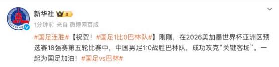 刚刚,在2026美加墨世界杯亚洲区18强赛第五轮比赛中,中国男足18强:0击败巴林队,成功突破“关键客场”。共同为国足加油!