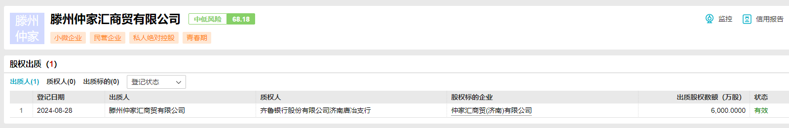 wind数据显示,今年8月底,仲家汇集团向齐鲁银行济南唐冶支行质押了济南仲家汇6000万股,质押率高达100%。此外,仲家汇集团还出售并实现了滕州仲家汇房地产有限公司90%的股份。